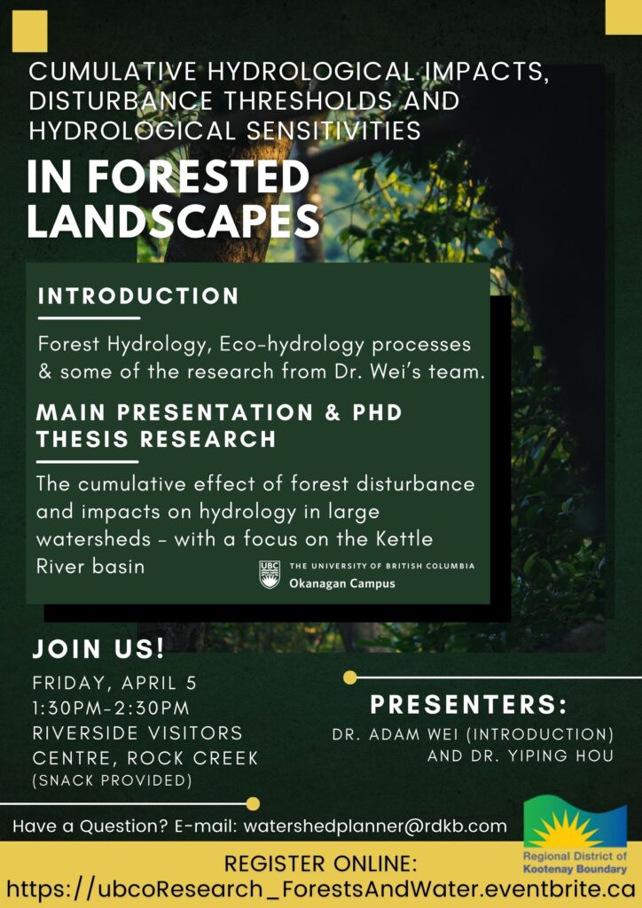 Come join us at the Rock Creek Visitors Centre to hear Dr. Yiping Hou and Dr. Adam Wei talk about their UBCO research on cumulative hydrological effects from disturbances in the Kettle River watershed forests.
