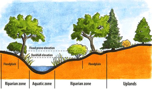 The riparian zone is the transitional area between the aquatic zone and the upland zone. Key features of the riparian zone include:
